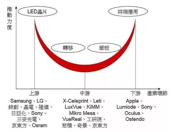 Micro LED产业链大致分为LED芯片、转移、面板与终端应用四大环节,目前以芯片和应用端推动力度最大,中端环节较为薄弱。已布局的上游厂商分别有Osram、Nichia、晶电、錼创(PlayNitride)与三安等;中游有LuxVue、mLED与台工研院;下游有Apple、Sony与Lumiode等。从区域来看,欧美厂商偏重下游终端应用开发,亚太厂商聚焦关键零组件的发展。