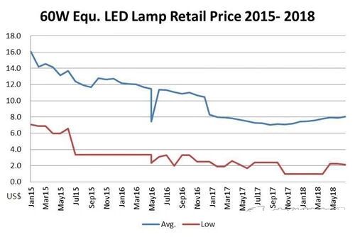 LEDinside自LED照明市场发展之初即开始追踪市场价格信息,根据LEDinside的历史数据,以一颗相当于60瓦的LED灯泡价格来看,此价格在2011年一月时约 45-50美元一颗,到了2018年七月,价格却已经下滑至不到10美元。
