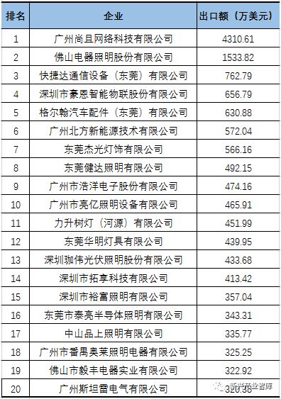 从出口企业来看,本月广东排名前20位的企业出口金额共1.42亿美元,占比约为12.5%,整个行业集中度依然较小,竞争非常激烈。其中排名前三的企业分别是广州尚且网络科技有限公司(4310.61万美元)、佛山电器照明股份有限公司(1533.82万美元)、快捷达通信设备(东莞)有限公司(762.79万美元)。