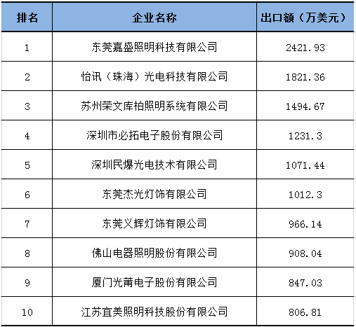 表1:2018年上半年LED球泡灯出口企业TOP10