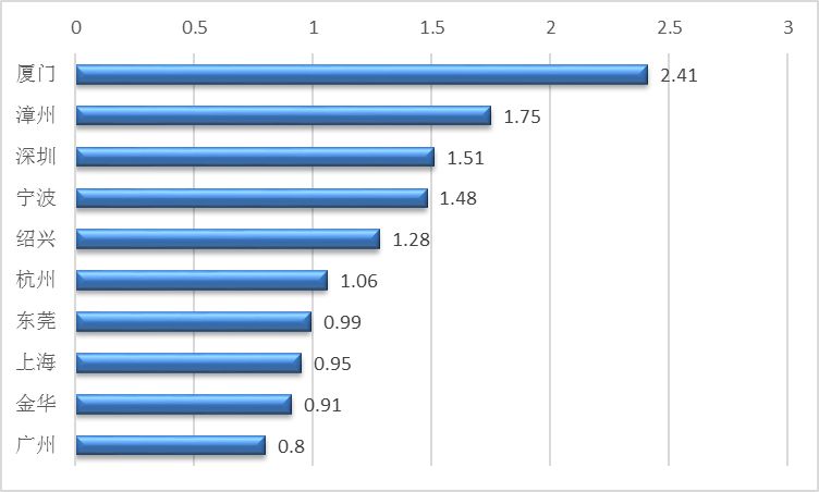 在2018年上半年我国LED球泡灯出口上,厦门一马当先,出口额高达2.41亿美元,占全国LED球泡灯出口总额的12.55%,漳州紧随其后,出口额为1.75亿美元,占比9.07%,深圳排名第三,出口1.51亿美元,占比7.84%。另外广东还有广州、东莞位列前十,分别出口0.99亿美元、0.80亿美元。